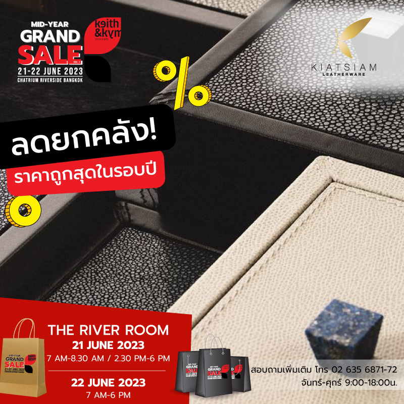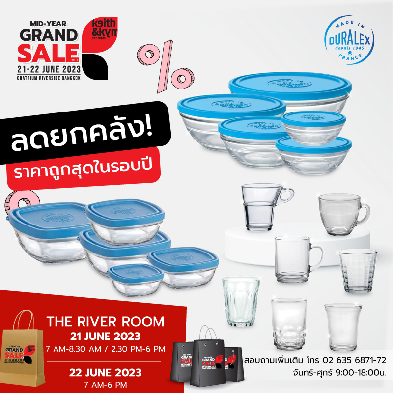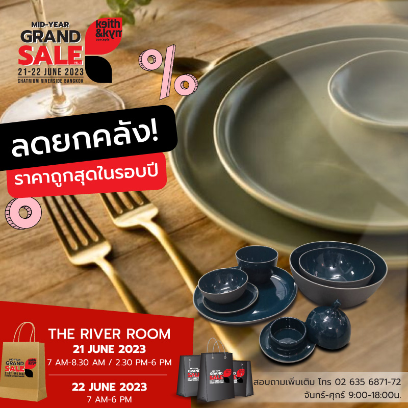 งานสินค้าลดราคากลางปี รับหน้าฝน จัดขึ้นในวันที่ 21-22 มิถุนายน 2565 ที่จะถึงนี้ เรามีสินค้าลดราคาพิเศษทั้งจากบริษัท คีธ แอนด์ คิม และจากหลากหลายพาร์ทเนอร์เข้ามาขายแบบ Clearance Sale นำโดยสินค้าของบริษัท คีธ แอนด์ คิม จะมีสินค้าลดราคาจากหลากหลาย Section ไม่ว่าจะเป็นจาน ชาม เครื่องใช้บนโต๊ะอาหารแบรนด์ดัง แก้ว Duralex, Bormioli Rocco, อุปกรณ์บาร์ เครื่องใช้ไฟฟ้า และหลากสินค้าของตกแต่งจากแบรนด์ดังที่คอลเลกชั่นบางตัวที่ไม่มีการผลิตซ้ำอีกแล้ว, ของตัวอย่างและสินค้าตัวโชว์คุณภาพดีที่ใช้งานในโรงแรมและร้านอาหารห้าดาวอื่นๆ